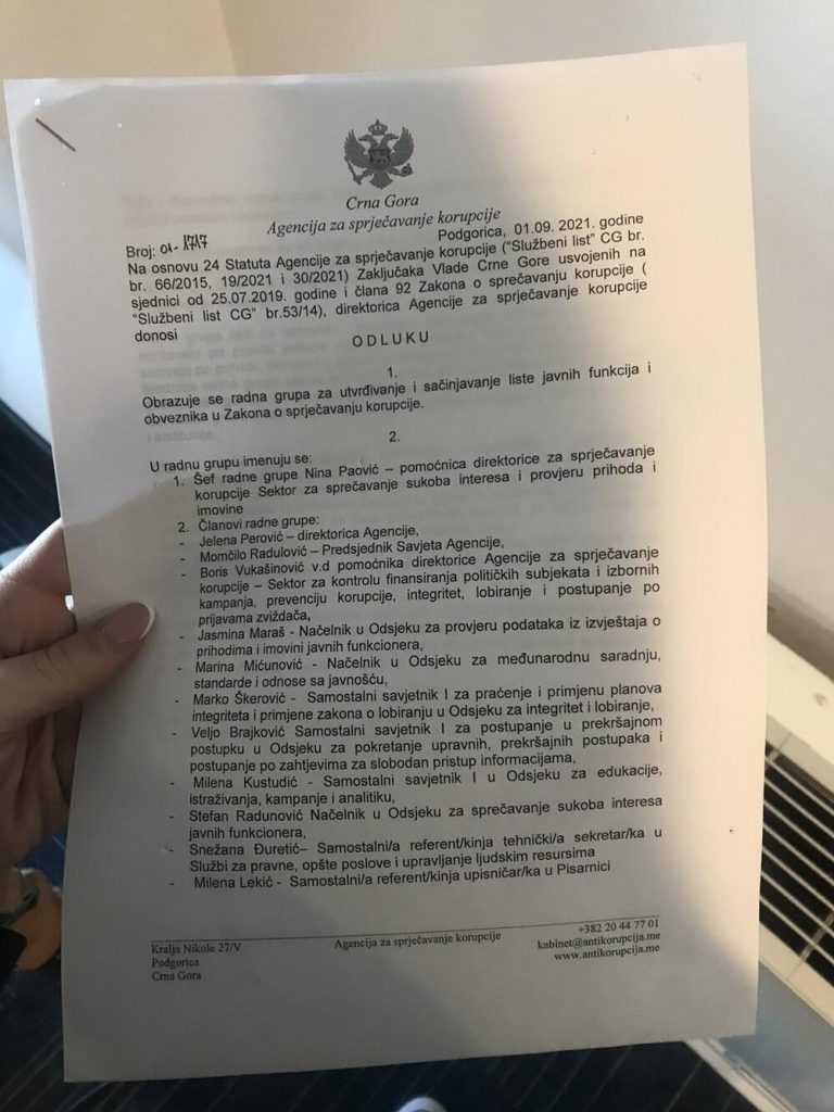Prema dokumentu, šefica radne grupe je pomoćnica direktorke Nina Paović, a članovi direktorka Jelena Perović, član Savjeta Agencije Momčilo Radulović, kao i zaposleni u toj instituciji Boris Vukašinović, Jasmina Maraš, Marina Mićunović, Marko Škerović, Veljo Brajković, Milena Kustudić, Stefan Radunović, Snežana Đuretić i Milena Lekić.