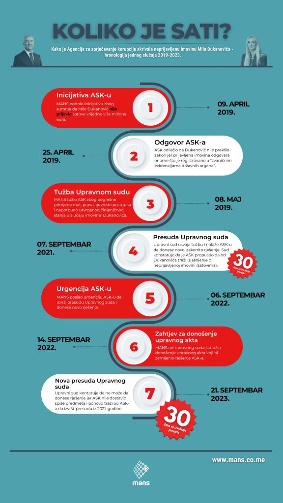 Iz Upravnog suda su nas informisali da nisu u mogućnosti da donesu pomenuti upravni akt jer ASK nije dostavio spise predmeta koji se odnose na provjeru Đukanovićeve imovine. Umjesto toga, Upravi sud je ASK-u ostavio novih 30 dana da izvrši presudu iz 2021. godine i pokrene zakoniti postupak provjere Đukanovićeve imovine.