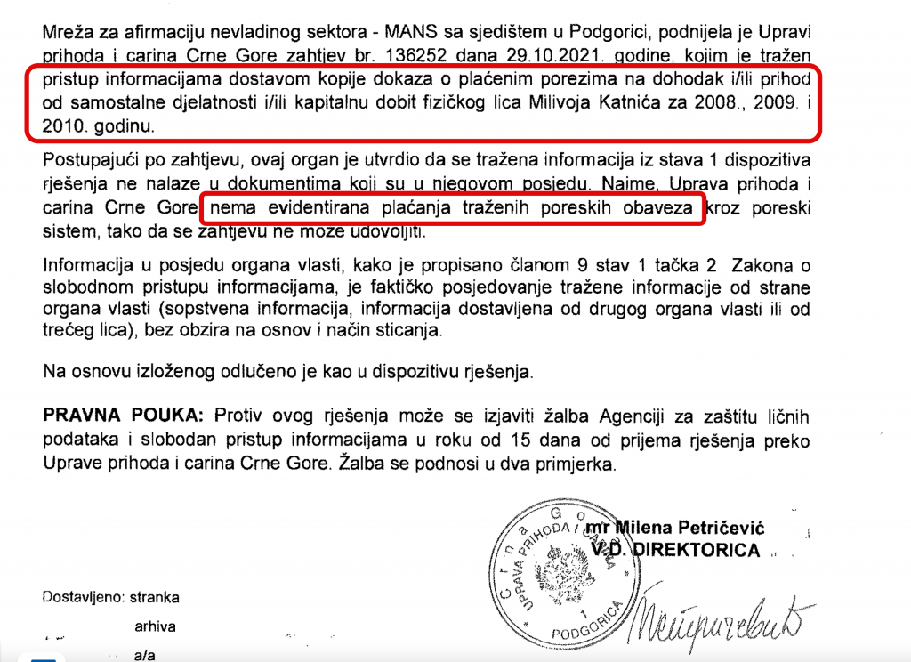 U odgovoru na slobodan pristup informacijama koji joj je uputio MANS, iz Uprave prihoda i carina su objasnili da u njihovom sistemu nema informacije da je Milivoje Katnić ikada platio ovaj porez.